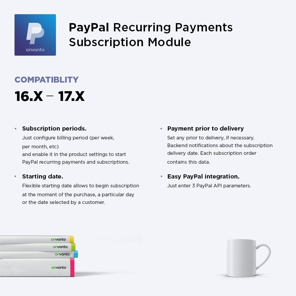 Este módulo te permite asociar tu tienda con la opción de pagos recurrentes y suscripciones de PayPal. Puedes crear períodos de facturación y aplicarlos a los productos. El sistema de pago redigirá a los clientes automáticamente a la página de pago de PayPal para finalizar la compra.